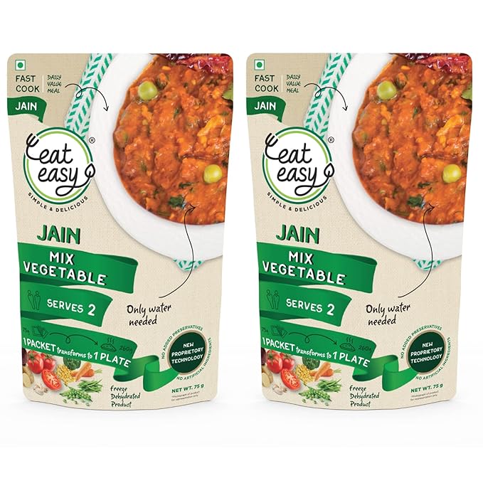 Enjoy homemade meals at any place anytime with our ready to eat meal packages. All you need is hot water to make and savor any of the food products by us. Bringing to you the traditional Indian cuisine made from handpicked finest of ingredients ,authentic flavors and Recipes curated and prepared by gifted women of kolhapur. Packed with utmost care and hygiene, eat easy brings to the realest taste without adding any preservatives, at your door in our travel friendly packets. Eat Easy Jain Mix Vegetable is a ready-to-eat instant meal that comes in two travel packs. This meal is specially designed for people who follow a Jain diet, which is a vegetarian diet that excludes certain root vegetables and tubers. The Jain Mix Vegetable meal is made with a combination of fresh vegetables and spices, and it does not contain any onion, garlic, or root vegetables. It is easy to prepare and can be enjoyed as a quick and convenient meal when you are on the go or when you don’t have time to cook. Each travel pack contains a single serving of the Jain Mix Vegetable meal, making it easy to carry with you wherever you go. Simply tear open the pack, heat the contents in a microwave or on a stove, and enjoy a delicious and nutritious meal that is both healthy and satisfying. Whether you are traveling, camping, or just looking for a quick and easy meal, Eat Easy Jain Mix Vegetable is a great option that is sure to please. So why not give it a try and see how delicious and convenient a Jain-friendly instant meal can be!